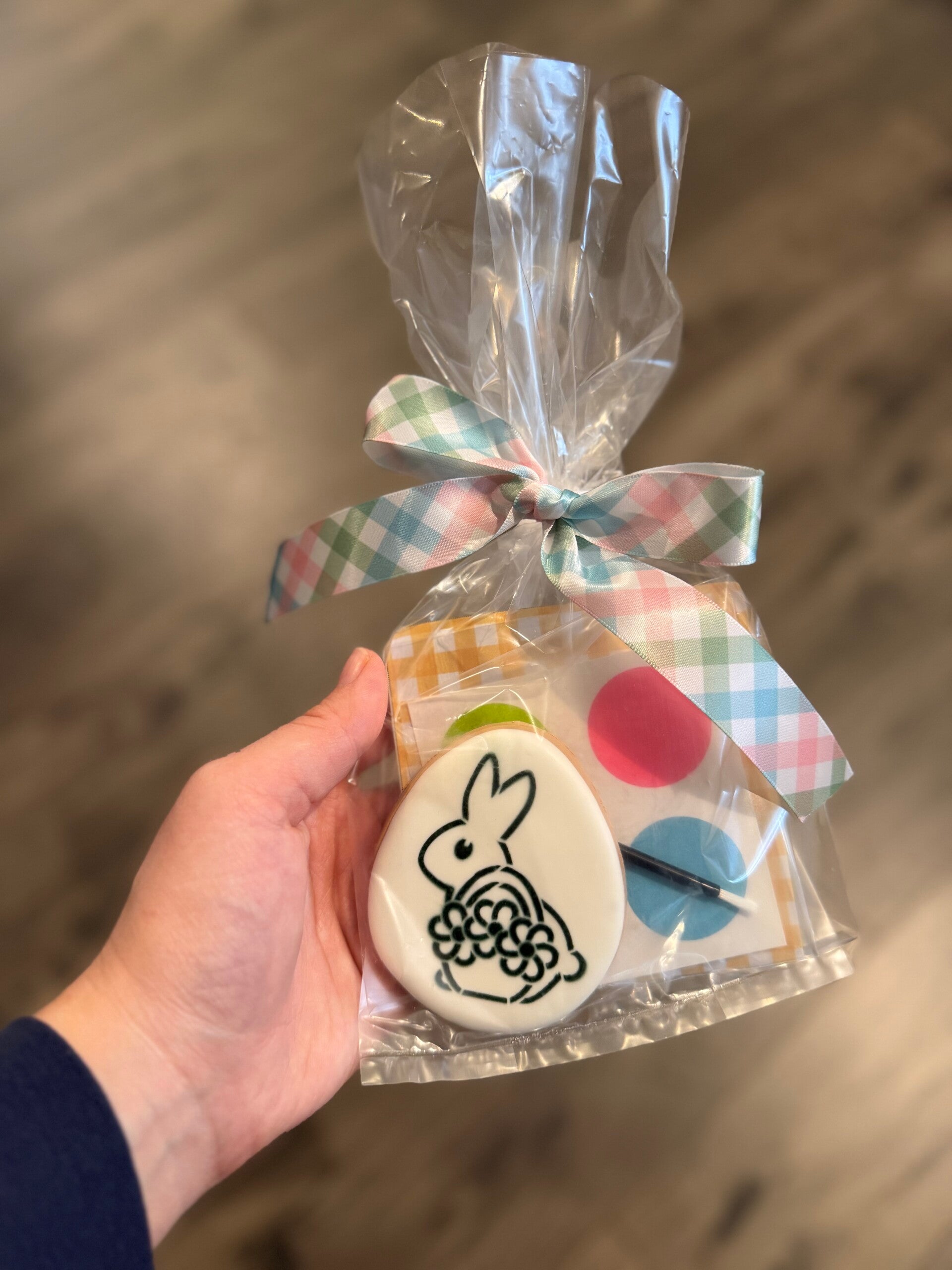 Paint-Your-Own Egg Cookie! A 3” egg-shaped sugar cookie featuring a cute bunny design. Each kit includes an edible paint palette and a mini food-safe brush for a fun and tasty activity. 🐰🎨