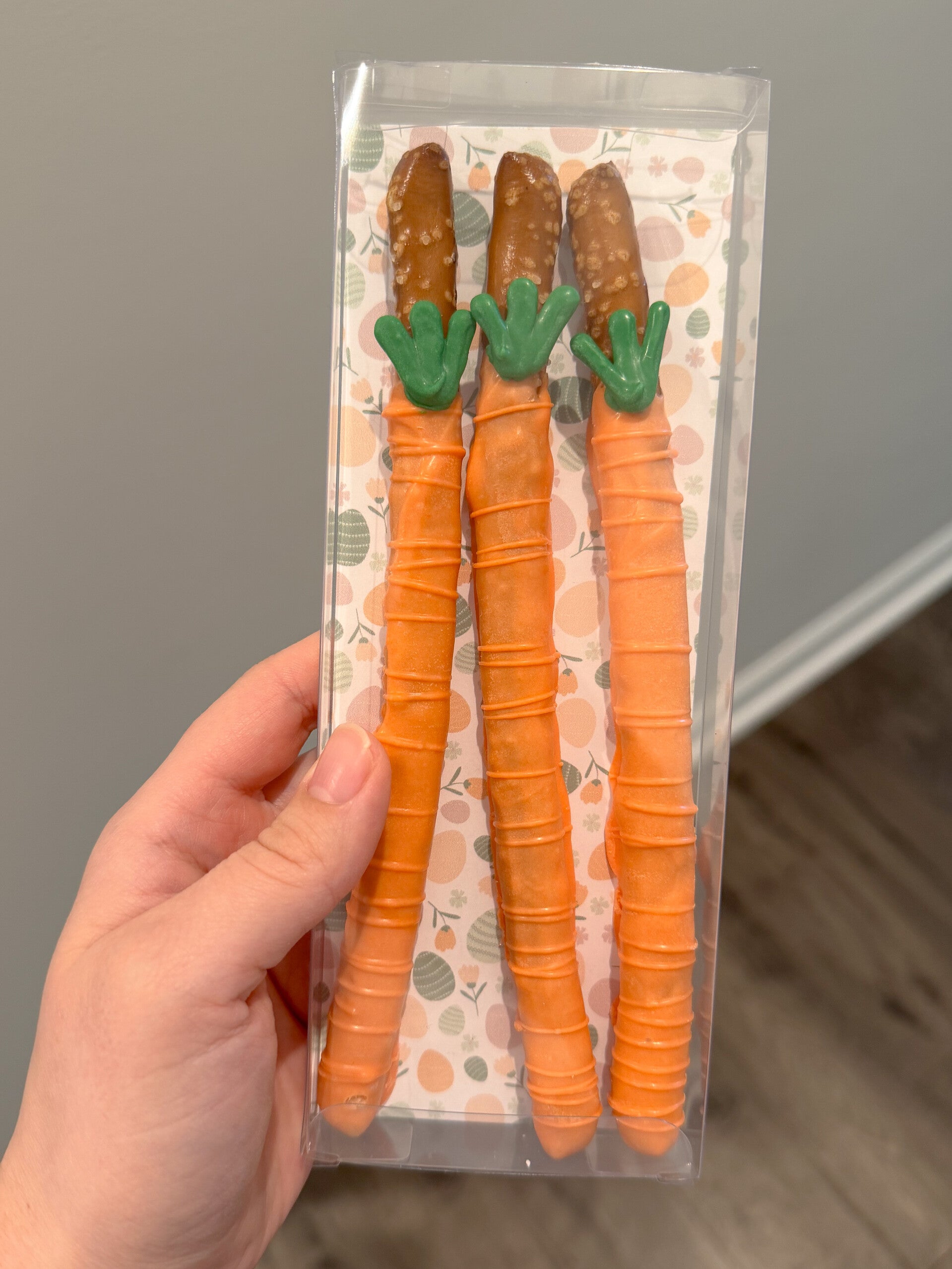 Pretzel rods dipped in chocolate and decorated to look like carrots. Each set comes with 3 pretzels packaged in a cute box. 🥕🍫
